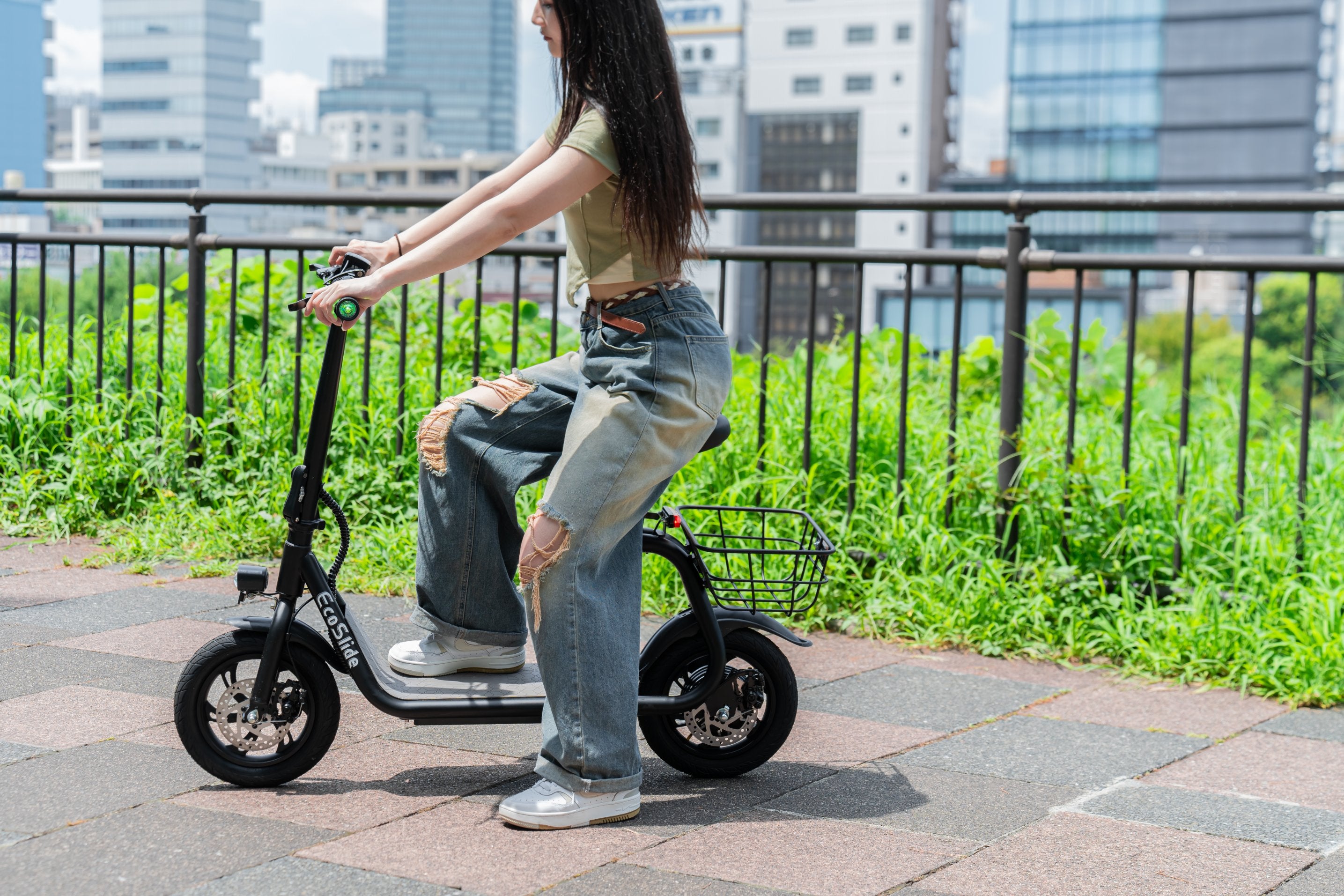 家の近所の移動なら、立ち乗りスタイルで涼しい風を全身に感じられます。ちょっと離れた先には、座り乗りスタイルで走っている風景を見ながら安心に走行。(私有地での撮影であり、公道での走行はヘルメット着用を推奨しております)